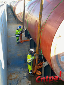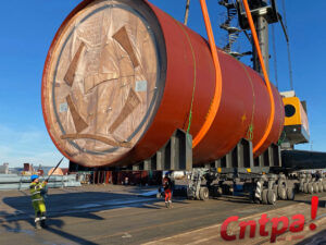 Ces diverses pièces sont, depuis, expédiées quotidiennement par la route, mais aussi par voie fluviale comme ce fut le cas lundi matin. Les dockers ont ainsi chargé à bord du Pasadena, un bateau rhénan de 110 mètres de long et de 10 mètres de large, 7 cylindres allant de plus de 80 tonnes pour le plus lourd à un peu moins de 40 tonnes pour le plus léger. La péniche doit décharger son contenu à Arques.